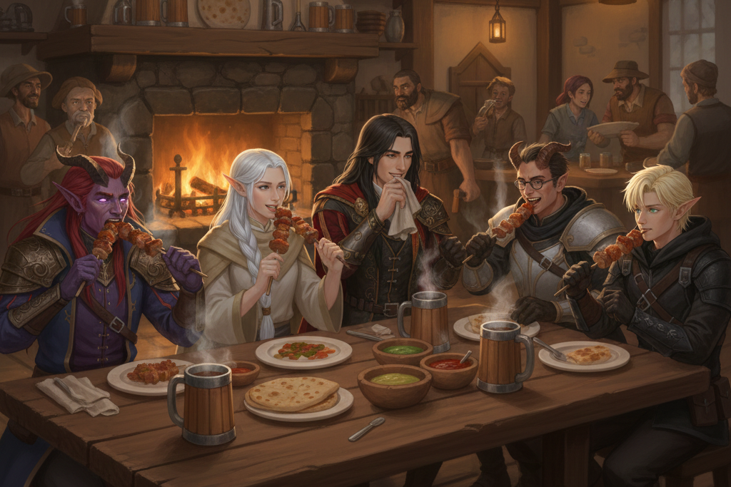 Im warmen Licht des Gasthauses Steinhügel stärkten sich die Helden mit würzigem Kebab, während zwischen Bissen und Gelächter erste Geschichten und Pläne geschmiedet wurden.